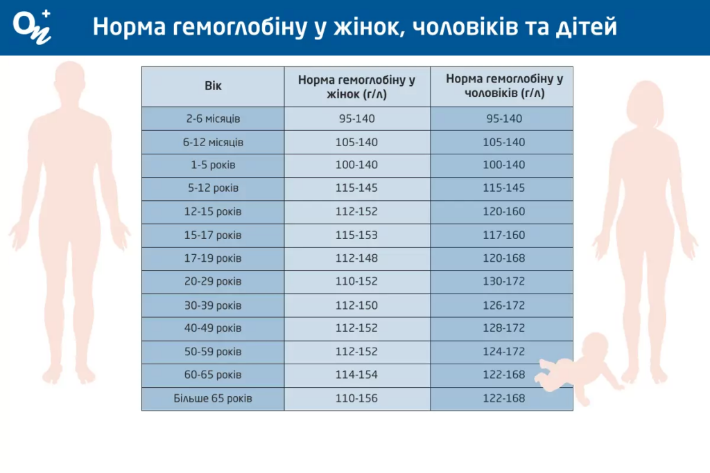 - критично низький рівень (анемія): показник нижче 110 г/л, що потребує обов’язкової корекції.